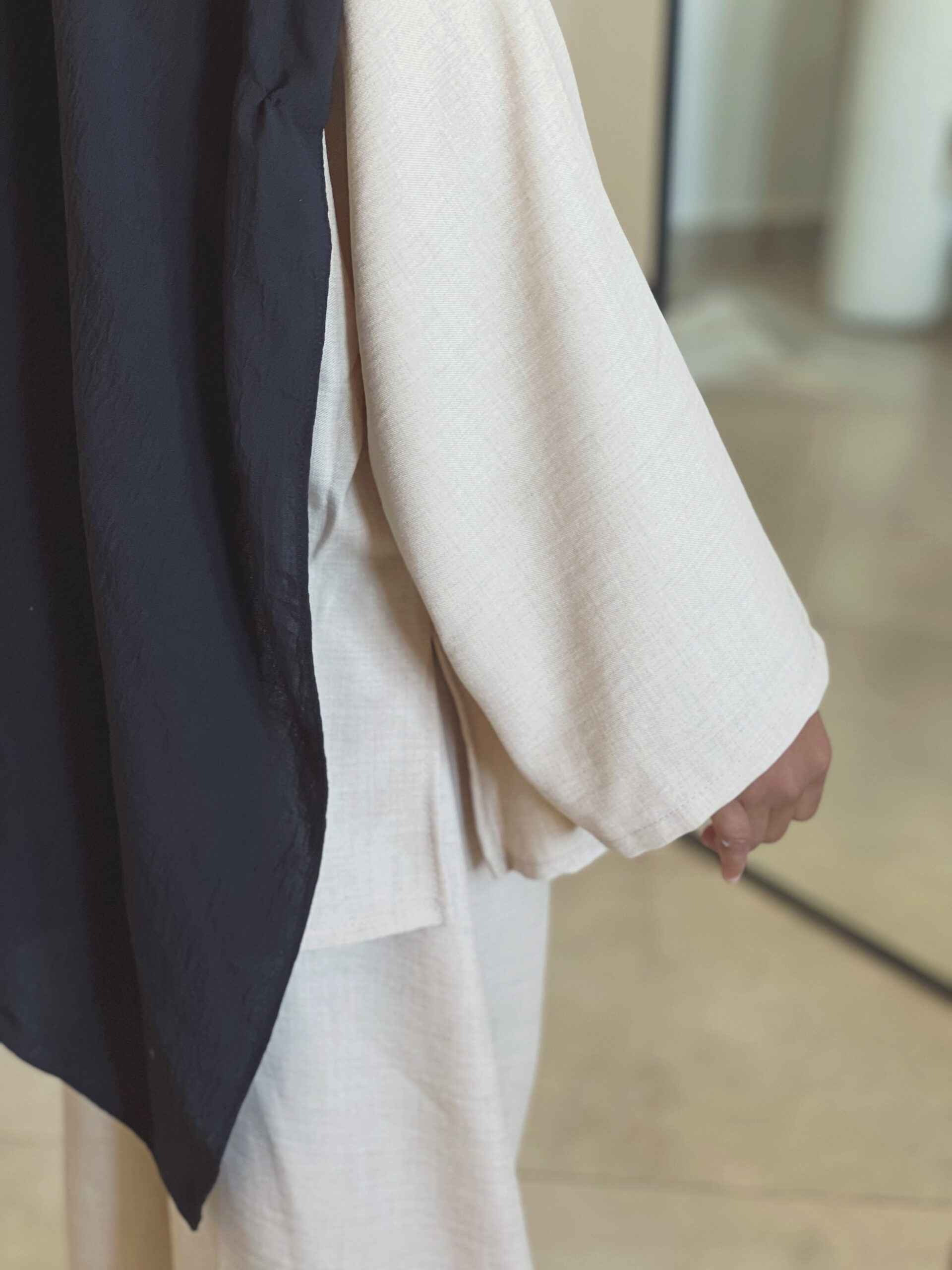- Tissu effet lin : texture fluide, douce et respirante, agréable à porter en toute saison.