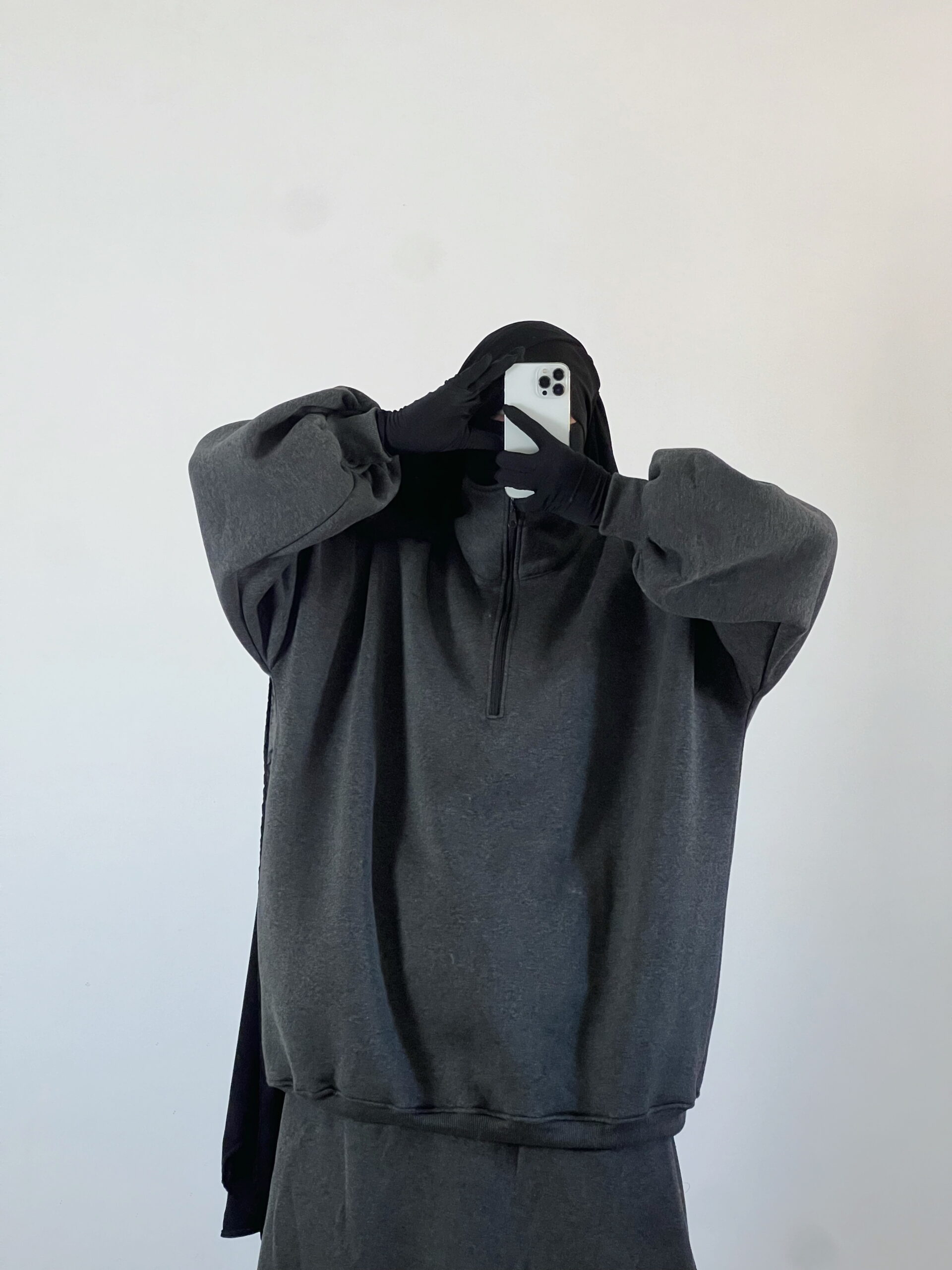 - Haut : ample, manches bouffantes, col montant zippé pour un look cosy et épuré